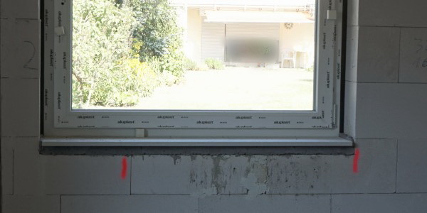 Auch außen sind die Fensterbänke angebracht. Hier haben wir uns für Blanc Perle geflammt entschieden. Es handelt sich um eine Granitart, ein Tiefengestein aus dem Oberkarbon (haha – heute findet man alles im IN). Auch dieser ist eher neutral, ein helle Grau. Natürlich hat er die notwendige Tropfkanten oben an den Seiten und auch unten am Rand entlang. Und sicher hat er seine 5 % benötigtes Gefälle. Man kann jetzt nicht mehr sehen, dass hinter der Fensterbank ein vorkomprimiertes Dichtband angebracht wurde. Die Außenfensterbänke stehen auch nicht arg über die Wand hinaus. Keine Ahnung wie stark der Putz sein wird. Am Ende jedenfalls soll die Tropfkante an der Unterseite 3 cm Abstand davon haben. Das wird hinhauen.