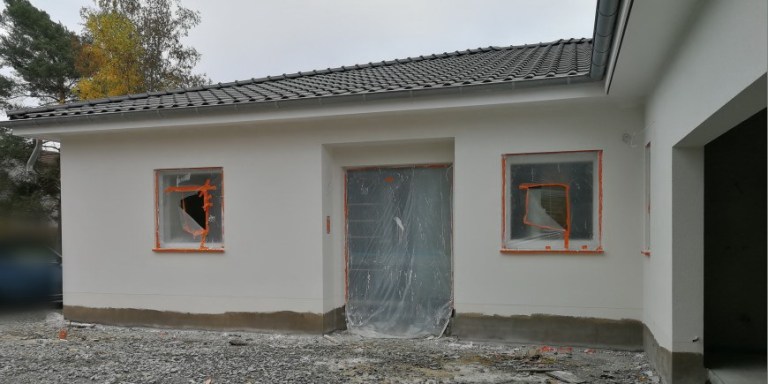 Fenster mit FolieDer Edelputz ist vom Stuckateurbetrieb Knobloch auch wieder gut ans Haus gebracht worden. Ecken, Fenster und andere Stellen machen einen sehr guten Eindruck. Am Übergang zwischen Haus und Garage gibt es noch immer eine Fuge, einen Schlitz, in jedem Fall ein auffallendes Etwas. Mal gespannt, wie dies im Endeffekt gelöst sein wird.