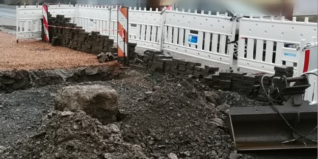 Da wir die Garagen auf die Grenze zum Nachbarn gesetzt haben, musste seine Mauer gekürzt werden (diese stand etwas über und war im Weg) und der gesetzte Randstein wurde entfernt. Zusätzlich mussten wir auf sein Grundstück und dort auch ein Stück in Unordnung bringen, da der Bagger sonst nicht greifen konnte. Diese Dinge werden jetzt von der Firma Klein wieder in Ordnung gebracht.