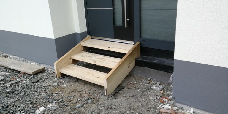Da unsere neuen Möbel schon übermorgen angeliefert werden, haben sich mein Mann und sein Bruder in die Garage zurückgezogen und bauen eine provisorische Eingangstreppe. An so etwas denkt man erst einmal gar nicht. Aber im Moment muss man ca. 40 cm Höhe überwinden um ins Haus zu gehen. Für die Eingangstreppe ist einiges an Holz und Gerät zu besorgen und nach kurzer Zeit sieht die Garage schon aus, als wäre sie seit Wochen in Benutzung. Allerdings nicht als Unterstand für ein Auto, sondern als Werkstatt eines Schreiners. Am Nachmittag ist unsere Eingangstreppe schon fertig. Wie nicht anders zu erwarten, passt sie perfekt, ist sehr zweckmäßig und sieht gut aus. So müssen die Möbellieferanten mit ihrer schweren Last keine riesengroße Stufe hinter sich bringen, sondern können ohne Probleme die Stufen gehen. Wie man sehen kann, ist auch unser Briefkasten bereits montiert.