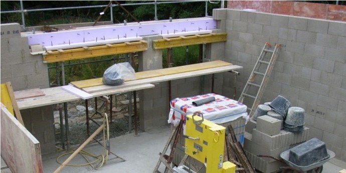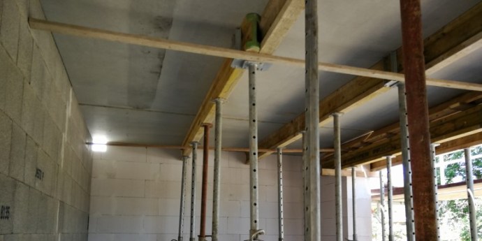 30.06.2018 Die Decke ist betoniert. Der Kamin ein Stück hochgemauert und der Stützpfeiler für die Terrassenüberdachung steht. Jetzt kann das Dachgebälk kommen. Ein fast spiegelglatter Betonteppich liegt auf unserem Haus. Einige LKW-Ladungen von Beton wurden …