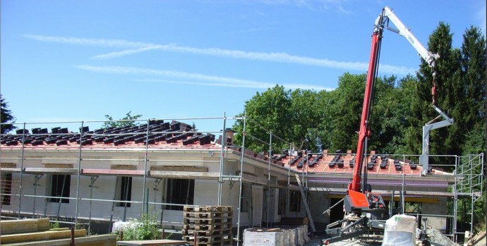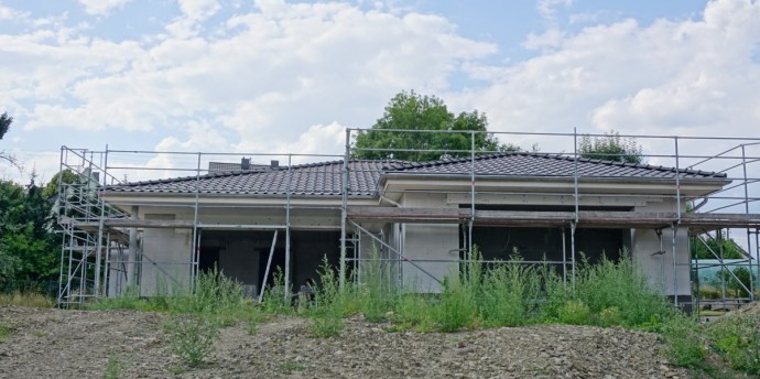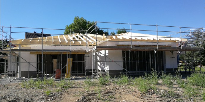 12.07.2018 Der Dachdecker Kiesgen war da. Das Dach ist fast fertig gedeckt. Form und Farbe gefallen uns besser als wir dachten. Die Fenster wurden angeliefert und stehen bereit. In der Zwischenzeit waren die Dachdecker fleißig …